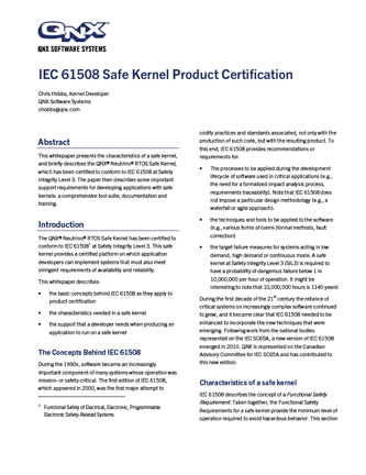 This whitepaper presents the characteristics of a safe kernel,and briefly describes the QNX® Neutrino® RTOS Safe Kernel, which has been certified to conform to IEC 61508 at Safety Integrity Level 3. The paper then describes some important support requirements for developing applications with safe kernels: a comprehensive tool suite, documentation and training.
